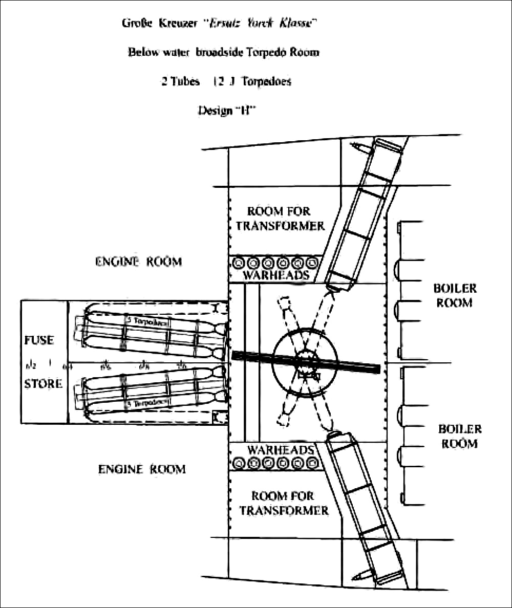 Однако башни для 381-мм орудий оказались не намного длиннее башен для 355-мм орудий. Расстояние от башни "А" до башни "В" и длину артиллерийского погреба также можно было сохранить. Но из-за больших весов башен их следовало передвинуть вдоль диаметральной плоскости корабля, чтобы привести в соответствие центр тяжести. Башни "А" и "В" сдвинули на 2,3 м в нос. Средняя артиллерия состояла из двенадцати 150-мм орудий с длиной ствола 45 калибров (6750 мм) и располагалась в батарее на средней палубе, удлиненной до 126 м, следующим образом: шесть орудий от башни "А" до передней боевой рубки, четыре около грот-мачты и два позади башни "D". Была предусмотрена установка восьми 88-мм зенитных орудий (или даже 105-мм) с длиной ствола 45 калибров. Торпедное вооружение было сведено к трем трубам - носовой и только двум бортовым. Расстояние между башнями "В" и "С" и тем самым длина средней части корабля также увеличилась на 2,5 м. Получившийся при этом прирост объемов помещений был использован наилучшим образом, и наконец получили долгожданное оптимальное положение отделения бортового торпедного аппарата. Теперь оно располагалось в средней части корпуса, между кормовым котельным и передним турбинным отделениями. Здесь в самой широкой части корабля оно было лучше защищено благодаря противоторпедному поясу большей ширины, чем в носовой части. Кроме того, заполнение его водой в результате пробоины не оказывало сильного влияния на дифферент, а это значительно повышало безопасность корабля. Также было сообщение о том, что должен быть размещён новый, более крупный тип торпеды. Торпеда J9 должна была иметь калибр 70 см и длину 9 м. Общий боекомплект составлял 15 торпед. Но этому новому положению бортовых торпедных отделений нужно было больше места, чем позволяли указанные 2,5 м. Для этого ликвидировали отсек, расположенный между котельными отделениями № 3 и № 4 и содержащий, кроме дизельной электростанции, артиллерийский погреб для двух 150-мм орудий. Чтобы эти орудия снабжать снарядами при помощи прямого элеватора, их сдвинули дальше к корме.