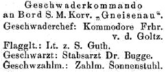 22 мая эскадра под командованием контр-адмирала Карла Фердинанда Батча вышла из Вильгельмсхафена. В её штаб вошли: командир - начальник штаба Адмиралтейства контр-адмирал Бач (Batsch), начальник штаба - корветтен-капитан Шрёдер (Wilhelm Schröder), флаг-офицер - лейтенант-цур-зее Криз (Kries), врач эскадры - штабврач ВМФ доктор Хюте (Dr. Hüthe), эскадренный машинный инспектор - старший нженер Бюддинг (Büdding). В начале июня в Гибралтаре к эскадре также присоединилась канонерка Comet, предназначенная в качестве Средиземноморского стационера.