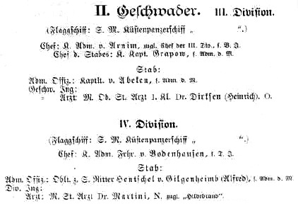 В этом году König Wilhelm с наконец отремонтированными машинами стал флагманом броненосной эскадры, которая – как и в предыдущие два года – должна была использоваться в демонстрационных целях в Средиземном море. Командиром эскадры был вновь назначен начальник военно-морской базы Северного моря контр-адмирал Беч (Bätsch), корветтен-капитан Цембш (Zembsch) - начальником штаба, а лейтенант-цур-зеее Адольф Тиле (Thiele) - флаг-лейтенантом.