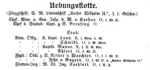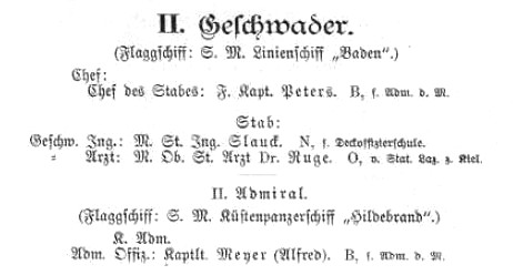 Эскадру начали формировать 22 апреля для обычных учений в домашних водах, но в связи с кризисом из-за убийства в Салониках через месяц была послана в Средиземное море. В её штаб вошли: командир - начальник штаба Адмиралтейства контр-адмирал Бач (Batsch), начальник штаба - корветтен-капитан Шрёдер (Wilhelm Schröder), флаг-офицер - лейтенант-цур-зее Криз (Kries), врач эскадры - штабврач ВМФ доктор Хюте (Dr. Hüthe), эскадренный машинный инспектор - старший нженер Бюддинг (Büdding).