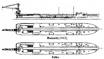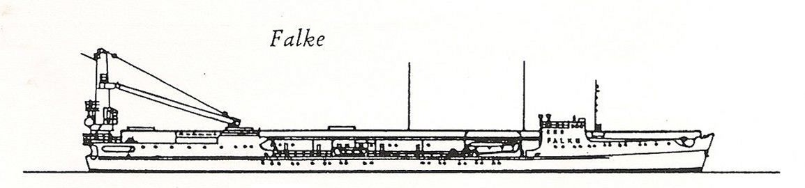 "Falke" (сокол), был спущен на воду раньше систершипа, 29 июля 1940, поэтому дал название всему типу, но достройка затянулась и в строй он вошёл только 22 ноября 1942 г. 7 декабря 42 корабль прибыл для испытаний в Травемюнде, но из-за плохой погоды ушёл в Засниц. 15 января 1943 "Falke" вошёл в состав SNB VIII, сперва в Ольборге. Он был придан разведгруппе KuFlGr 1./706 и 28-29 января 1943 перешёл в Берген. 13 февраля 1943 на корабле произошла авария механизмов, к 20 февраля 1943 вероятно был отремонтирован.