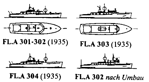 На основе опыта, полученного при испытании купленного в Британии глиссера A-1, двум верфям заказали опытовые серии по четыре катера под немецкие моторы. Катера, спроектированные и построенные верфью Naglowerft были несколько крупнее "англичанина", рубка была смещена за машинное отделение, что-бы уменьшить забрызгивание. Были уже и чуть быстрее "коллег" постройки Abeking & Rasmussen. В целом, не смотря на увеличение размеров и мощности моторов, добиться существенного улучшения мореходности не удалось, а максимальная скорость и дальность заметно уступали британскому прототипу, но в отличие от него новые катера имели радиостанцию и были оснащены радиопеленгатором. Кроме того, задиравшийся при глиссаде нос ощутимо закрывал обзор, поэтому в 1937 на всех катерах была рубка была перенесена в переднюю часть (по некоторым данным на FL. A 303 она была такой с самого начала). Вторая пара отличалась несколько приподнятым полубаком, что было сделано, вероятно, для того, что-бы поднять потолок располагавшегося там кубрика, в который иначе можно было войти только полусогнутым.