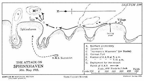Войска высадились в 4:15 к югу от Сфинксхафена не встречая сопротивления. В это время "Guendolen" вошёл в залив. В 500 м от деревни немцы заметили противника и открыли огонь. "Guendolen" тоже был обстрелян. В 11:00 англичане атаковали форт, но не обнаружили противника - немцы ушли.