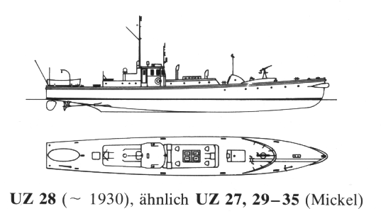 29Вооружение по штату составляла 52-мм пушка, но так, как катера вступали в строй уже после войны, контрольная комиссия Антанты разрешила ставить только 1 пулемёт. Судя по имеющимся фотографиям, на UZ 35 (по др. данным на UZ 34) в какой-то момент (в 1922?) пушка всё-таки стояла, однако многие катера "временно" вообще не имели никакого вооружения. Про противолодочное речь даже не шла - устанавливать его в тот период не имело никакого смысла. Нет также никаких данных о возможном привлечении этих катеров к послевоенному тралению.