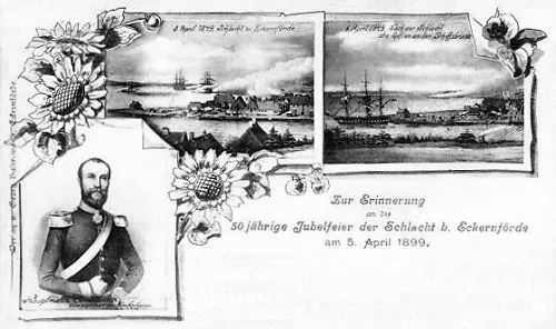 Событие это относится к первой шлезвиг-гольштинской войне. Суть конфликта была в том, что Гольштиния тогда уже входила в Германский союз, а Шлезвиг принадлежал датчанам. С общей подначки Пруссии шлезвиг-гольштинцы решили побороться за независимость и воссоединение обоих герцогств, неделимость которых "на вечные времена" была закреплена еще Рипенским договором 1460 года. При поддержке "прусской военщины" они начали довольно резво наступать по суше на север, заняли Экернфёрде, сам город Шлезвиг и продвинулись вплоть до нынешней границы, чего датчане просто так терпеть не собирались. Тем более, что Дания в то время имела довольно мощный военный флот, чего нельзя было сказать о "сухопутном" Германском союзе. Против Экернфёрде была послана эскадра в составе линейного корабля "Christian VIII", парусного фрегата "Gefion" и двух пароходов (в общей сложности 148 орудий). Противостоять им могли лишь две наскоро оборудованные береговые батареи по восемь полевых пушек, возведенные под руководством прусского лейтенанта Вернера фон Сименса (впоследствии известного изобретателя, основателя фирмы Siemens), командовал которыми Эдуард Юлиус Юнгманн.