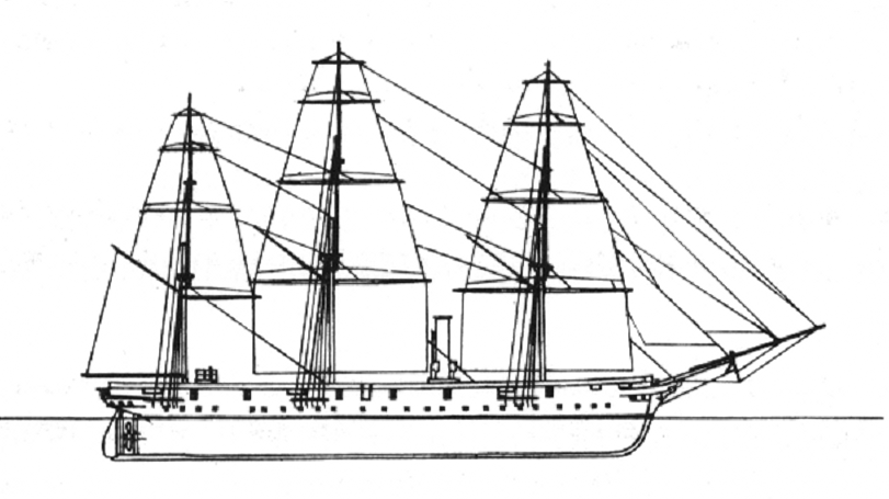 | белый - широкая полоса по всей длине корпуса около ВП и тонкая полоса по краю медной обшивки около 0,5 м. над ВЛ, комингсы люков, штурманская рубка, павильон, вентиляторы, дефлекторы, стойки лееров и тентов, салинги, кормовые и носовые украшения, щиты орудий и казематов |