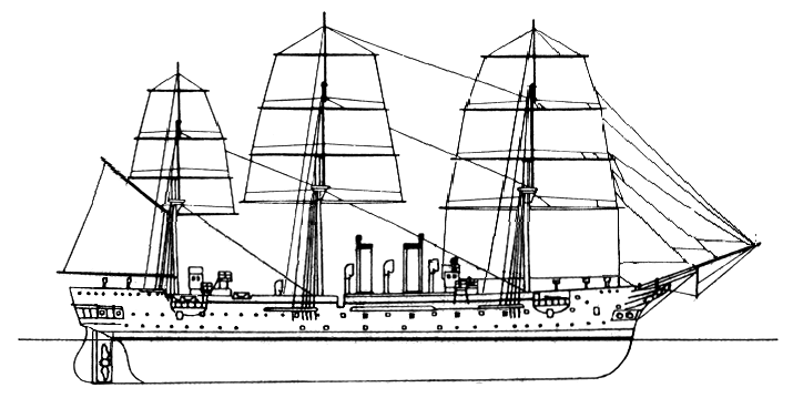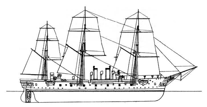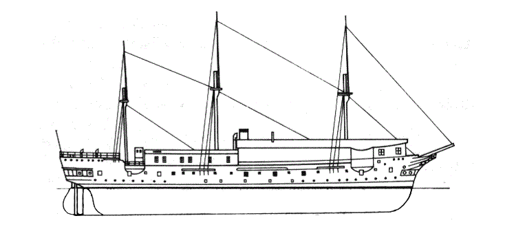 В штиль, при входе в труднопроходимый район или при подготовке к бою корабль шел под парами. Для этой цели имелись две горизонтальные двухцилиндровые паровые машины двойного расширения. Они располагались друг за другом в машинном отделении и действовали вместе на один гребной вал, на заднем конце которого устанавливался двухлопастный гребной винт диаметром 5,35 м. Указанная максимальная мощность составляла 3119 лошадиных сил (2294 кВт). При необходимости для экономии топлива передняя машина могла отключаться. Пар для работы двух машин вырабатывался в восьми поперечных цилиндрических котлах, которые были распределены по двум котельным. В 16 топках создавалось давление пара 5 атм (4,9 бар) при общей площади обогрева 1064 м². Силовая установка была спроектирована для достижения скорости 13,5 узлов при максимальных 92,9 оборотах вала в минуту. За каждой котельной была закреплена дымовая труба. Эти дымоходы были устроены таким образом, чтобы верхняя часть трубы могла телескопически уходить в нижний кожух дымохода во время маневрирования под парусами.