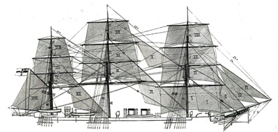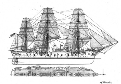 | белый - широкая полоса по всей длине корпуса около ВП и тонкая полоса по краю медной обшивки около 0,5 м. над ВЛ, комингсы люков, штурманская рубка, павильон, вентиляторы, дефлекторы, стойки лееров и тентов, салинги, кормовые и носовые украшения, щиты орудий и казематов |