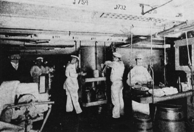 В корме на батарейной палубе также располагался запасной штурвал управления (еще один был внизу на промежуточной палубе). По остальной части палубы были распределены осушительные помпы. На каждые два отсека был предусмотрен один насос. В носовой части батарейной палубы доминировал бушприт и его массивные несущие балки. С обеих сторон была сосредоточена якорная установка. Здесь якорные цепи проходили через запираемые снаружи клюзы на палубе. Чтобы поставить корабль на якорь, эти цепи можно было разместить на четырех тяжелых якорных кнехтах. При подъеме якоря они пробегали по нижнему кольцу шпиля, а затем исчезали в цепном ящике двумя палубами ниже. С каждой стороны была больничная палата, оборудованная качающимися койками и санузлом.