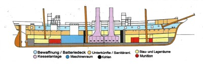 На батарейной палубе находилось основное вооружение. Первоначально за бойницами с каждой стороны было по семь 15-сантиметровых кольцевых орудий. Над ними растягивали свои гамаки некоторые члены экипажа. Между орудиями были установлены скамейки и столы, где принимали пищу. Фиксированное распределение места приводило к закреплению каждого человека за обеденным сообществом (Backschaft) — самой малочисленной боевой единицей на борту. Когда эти столы и скамейки не использовались, они убирались под палубу наверху. Пищу готовили на двух камбузах. Они располагались на батарейной палубе. На каменном настиле размером в несколько квадратных метров располагалась железная печь с котлом и духовкой. Камбуз располагался экипажа перед шахтами труб, офицерский камбуз - за ними. Камбуз в кормовой части возле командирской части батарейной палубы имел расширенный и улучшенный ассортимент питания, доступного только командованию корабля. За бизань-мачтой во всю ширину располагался салон. Сзади черех палубу проходила шахта подъёма винта. Вокруг него был кабинет, спальня и ванная комната командира с ванной и туалетом.