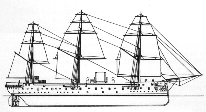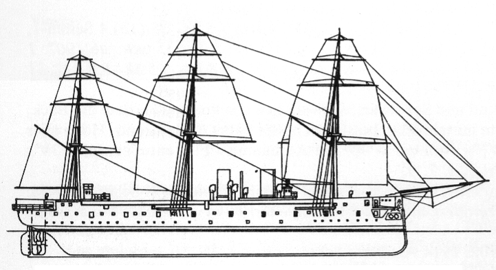 | белый - широкая полоса по всей длине корпуса около ВП и тонкая полоса по краю медной обшивки около 0,5 м. над ВЛ, комингсы люков, штурманская рубка, павильон, вентиляторы, дефлекторы, стойки лееров и тентов, салинги, кормовые и носовые украшения, щиты орудий и казематов |