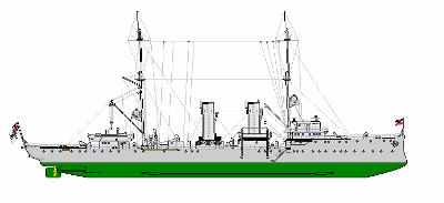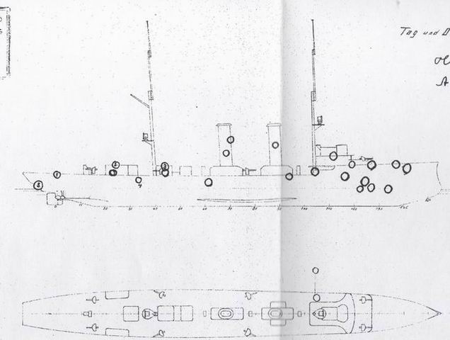учебный корабль при минной школе, в 1910-1911 модернизирован на <Kaiserl. Werft> в Киле, 2.07.1915 повреждён артиллерией российских крейсеров и выбросился на берег о. Готланд, снят и отбуксирован в Фарёзунд (Швеция), 1.10.1915 оф. интернирован в Оскарсхамне, 01.1919 возвращён в Киль, где 23.01.1919 поставлен на прикол, 21.03.1921 списан и сдан на слом в Гамбург за 900 тыс. М. |