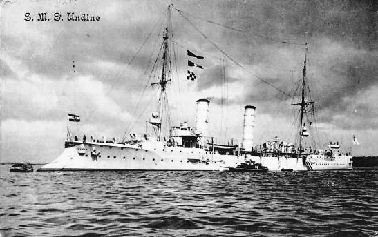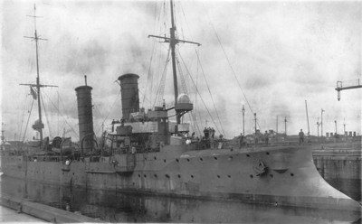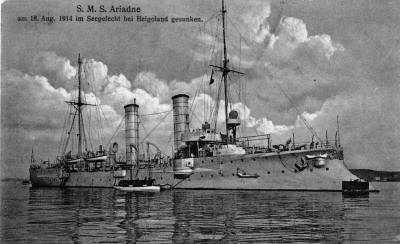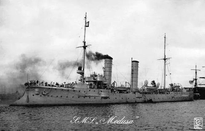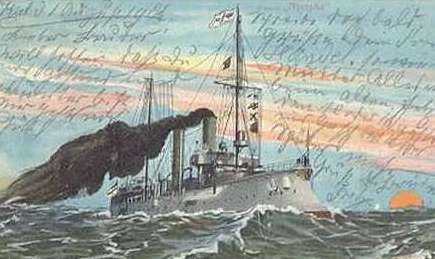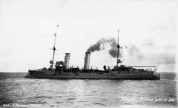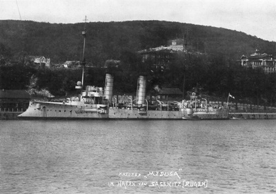 Сразу после взрыва нескольким офицерам и матросам показалось, что они ясно видели с правого борта перископы подводной лодки, по которым открыли огонь передние орудия. Вскоре после обнаружения предполагаемой первой подводной лодки другие члены экипажа утверждали, что видели перед носом вторую подводную лодку, по которой также был открыт огонь. Командир, фрегаттен-капитан Мюзинг (Mysing), который был ранен при взрыве, направил крейсер к Арконе, чтобы вывести сильно поврежденный корабль на мелководье, но вскоре были потеряны оба винта и корабль остановился. К нему поспешил на помощь случайно проходивший мимо шведский паром "Koning Gustav V", идущий рейсом из Треллеборга в Зассниц, но почти сразу подоспели посланные адмиралом миноносцы 20-й полуфлотилии "G.132" и "G.134", и паром смог продолжить свой рейс.