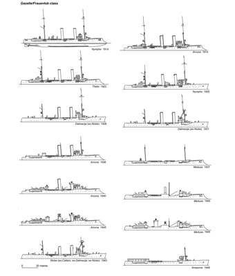 "Gazelle" сдана на слом в конце войны, остальные 6 оставались в распоряжении имперского морского флота. Из них "Medusa" с июля 1920 по сентябрь 1924 и "Arcona" с мая 1921 по декабрь 1923 находились на службе. Они были сменены "Amazone", которая оставалась на службе до января 1930. В апреле 1922 на службу поступил "Thetis", которого в ноябре 1924 сменила "Nymphe", остававшаяся на службе до апреля 1929. "Niobe" в германском флоте был только резервным кораблем и позже продан Югославии. Югославский учебный крейсер был вновь принят в эксплуатацию немецким флотом в сентябре 1943 под старым именем с немецко-хорватской командой, однако, уже 22 декабря 1943 погиб.