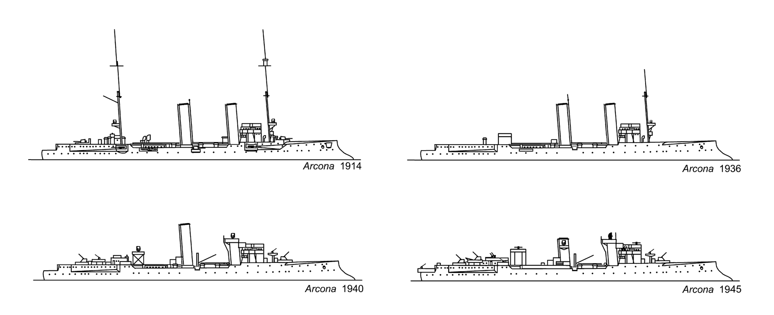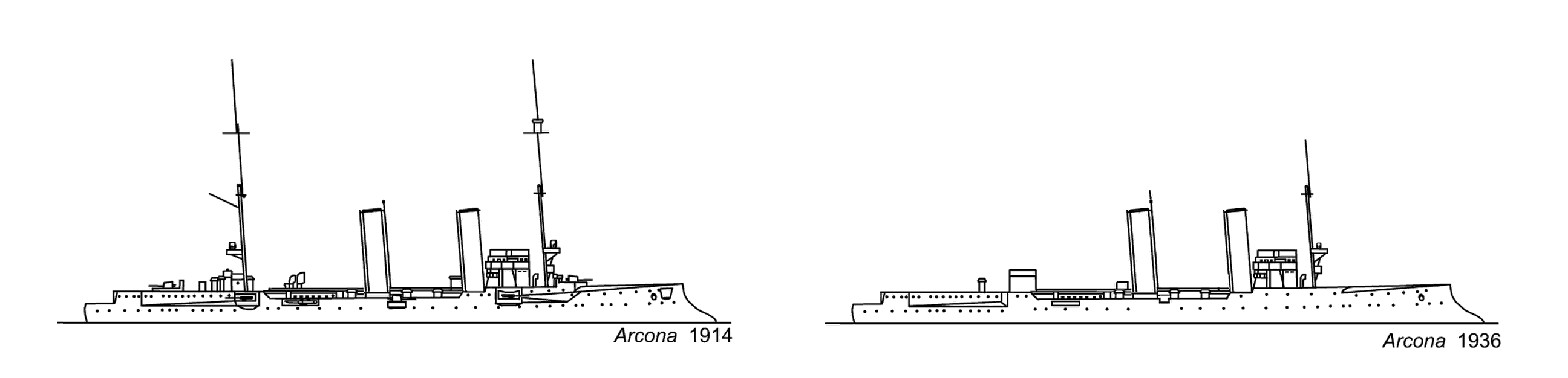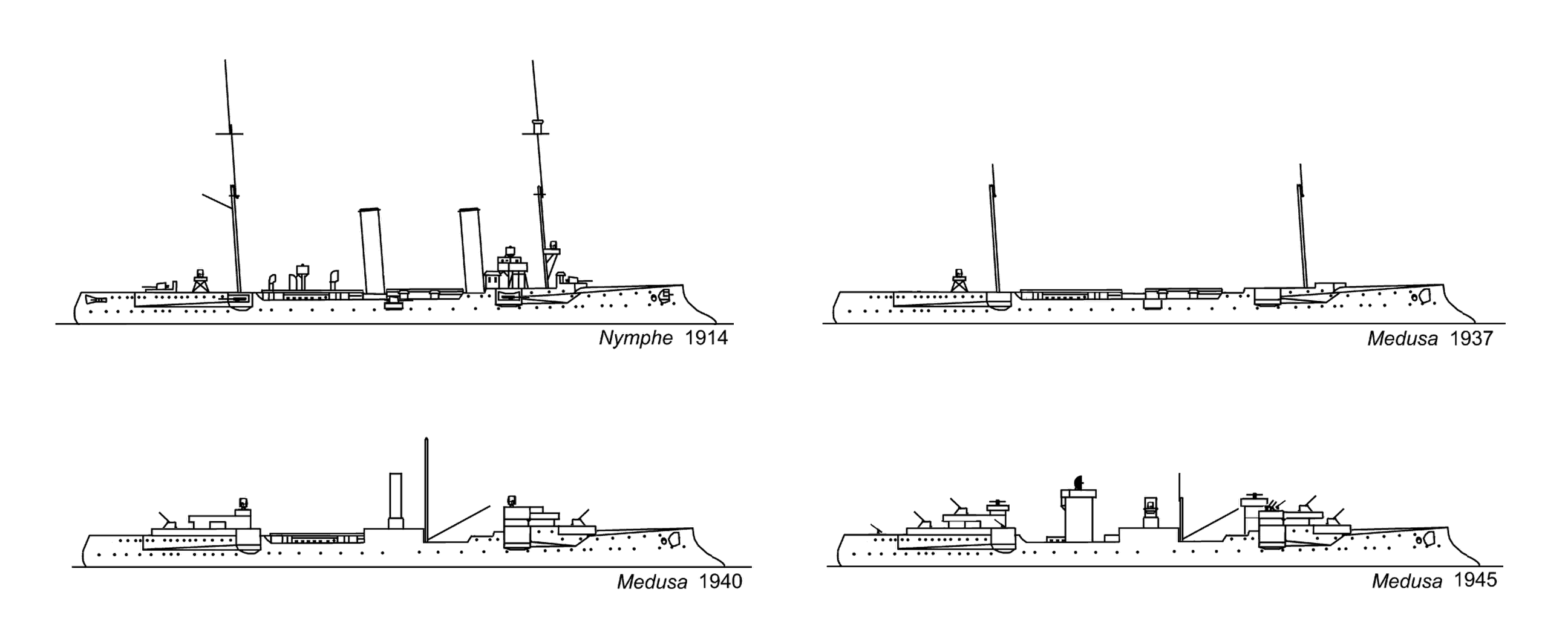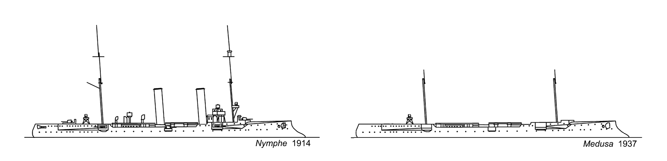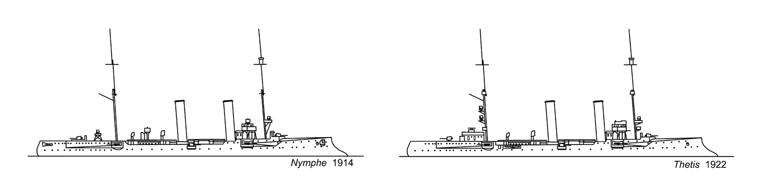 Позже щиты 105 мм пушек в "гнездах ласточек" были укорочены до нижней трети, компасные площадки на многих кораблях демонтировали. Переоборудованый в минный заградитель "Arcona" получил срез в корме для установки минного оборудования. На "Medusa" в 1920 на кормовой надстройке установлена площадка с дальномером. На "Thetis" с 1921 кормовые надстройки и мачта были как на модернизированном "Amazone" (однако, с радио-стеньгой) и всегда оставались старые дефлекторы.