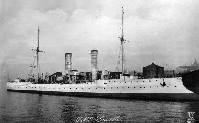 Спуск на воду крейсера IV класса "Korvette G" был произведён 31 марта 1898 в присутствии Виктории, вдовы покойного кайзера Фридриха III, и ее невестки, принцессы Ирены. Контр-адмирал Альфред фон Тирпиц окрестил корабль именем "Gazelle" (Газель) в честь винтового фрегата "Gazelle" (1862-1884), прославившегося кругосветной научной экспедицией. После достройки "Gazelle" 23 ноября 1898 вошёл в строй и начал испытания, во время которых 10 февраля 1899 около 08:00 у Штоллергрунда во внешней части Кильского залива столкнулся с датским пароходом «Ellida», который в результате затонул в 18 милях от берега на глубине 20 метров. Экипаж был спасен крейсером, который сам получил незначительные повреждения: были помяты несколько листов обшивки в носовой части.