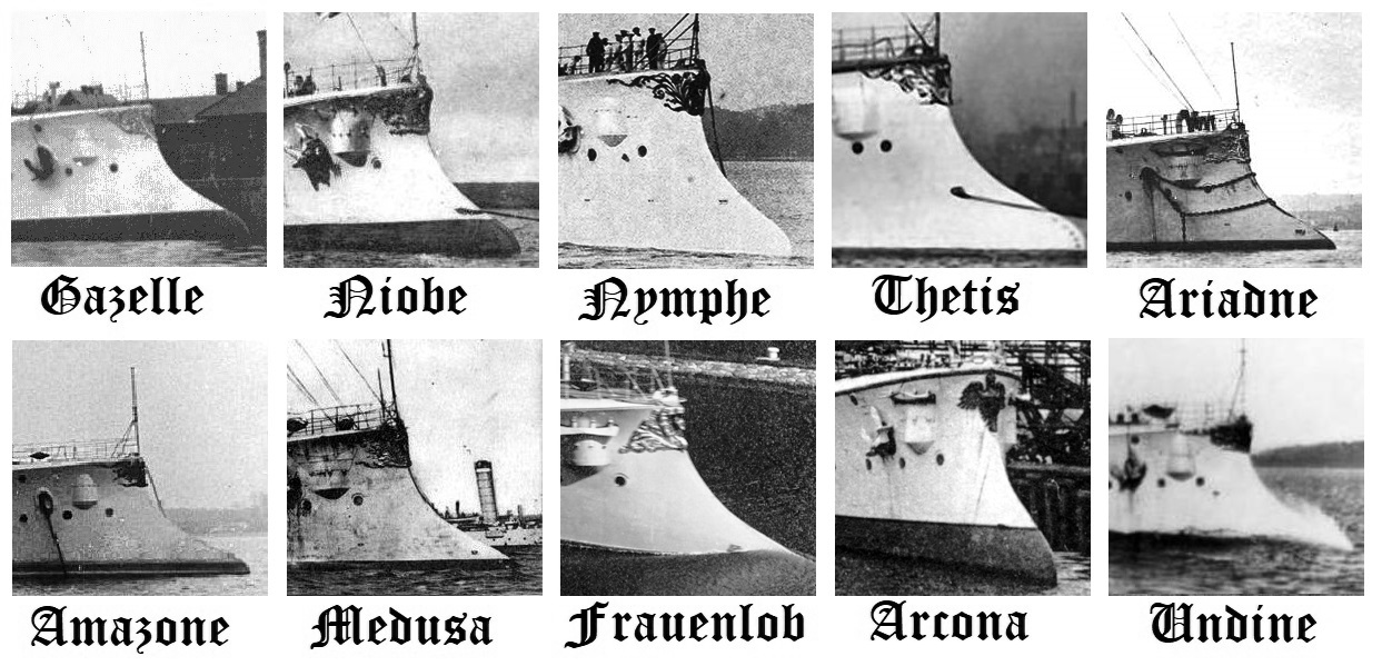 Курсовой торпедный аппарат имел только головной "Gazelle". На нём траверзные торпедные аппараты были надводными (на ВП), на прочих — подводными. На "Gazelle" штурманская рубка поначалу находилась между дымовыми трубами, на остальных — перед передней трубой. На "Niobe" трубы были расположены, как на "Gazelle", на остальных были разнесены шире. На "Nymphe" и "Thetis" вентиляторы были сначала высокие, но вскоре их опустили на 2 м. На "Medusa" и "Ariadne" за второй трубой выделялся высокий дефлектор. Последняя тройка отличалась значительно более массивными рубками, другим расположением дефлекторов. "Arcona" выделялась характерными грибовидными вентиляторами, "Frauenlob" и "Undine" - "гармошечными".