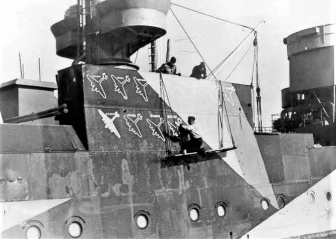 | светло-серый - верхняя палуба, надстройки, трубы, вентиляторы, мачты и т.п., включая орудия, башни и щиты |