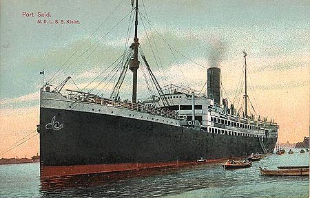 Начиная с 22 февраля и 9 апреля 1913 года "Kleist" выполнил два рейса из Бремена в Нью-Йорк, затем еще одно путешествие из Бремена в Австралию. 3 сентября 1913 года корабль возобновил рейсы на Дальний Восток, начав свое последнее путешествие по этому маршруту 13 мая 1914 года. На обратном пути капитан получил по радио сообщение о том, что Россия и Франция объявили войну Австро-Венгрии и Германии, и что мобилизуются Голландия и Бельгия. Он высадил пассажиров в Коломбо на британском Цейлоне, а затем отправился в Голландскую Ост-Индию, где укрылся в Паданге на Суматре. Вероятно, рассматривались варианты использования корабля в качестве рейдера или снабженца, но до этого дело не дошло и он простоял в Паданге да конца войны.