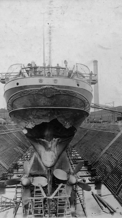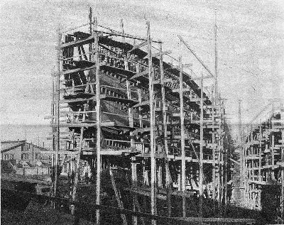 16 марта 1896 года была заложена первая килевая плита лайнера, а 26 августа - через 5 месяцев и 10 дней - был установлен весь фальшпол, а также все 235 шпангоутов, и даже прикреплена часть внешней обшивки. 3 апреля 1897 года, через двенадцать с половиной месяцев после начала работы, все 35 поясов внешней обшивки - общий вес которых составлял 1580000 кг - были заклепаны, а 4 мая 1897 года корабль был спущен на воду. Таким образом, вся огромная масса железа и стали была готова менее чем за 14 месяцев. Вес при спуске, включая боковые подставки, каждая длиной 167 м, составлял 8330 т, наклон был 1:19,2, а давление на квадратный сантиметр составляло 2,264 кг. Спуск контролировался двумя носовыми якорями с цепями диаметром 51 мм, которые были прикреплены к обшивке кормы и также должны были инициировать поворот корабля. Чтобы не получить слишком внезапное и сильное воздействие на цепи, они имели амортизаторы из двух дубовых балок.