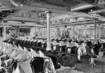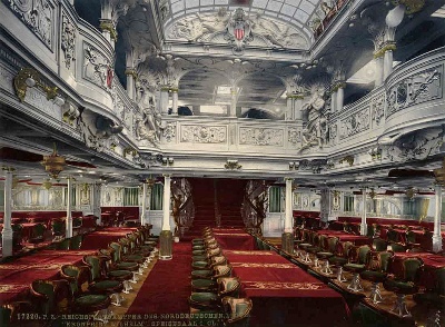 Большая главная лестница вела прямо в столовую, которая занимала всю ширину корабля, а именно 19,5 м в ширину, 18 м в длину и высотой 2,89 м, с сиденьями для 299 пассажиров. Весь этот зал был оформлен в стиле раннего итальянского ренессанса с легкой позолотой отдельных частей, а также изобилием масляных картин. В нишах располагались удобные места для отдыха со смирнскими коврами, скатертями и шторами в цветных тонах, большое количество электрических лампочек было тонировано. Основная световая шахта над залом проходила через верхнюю палубу к прогулочной и была окружена колоннами, между которыми были расположены арки таким образом, что из проходов на верхней палубе можно было спокойно спуститься в столовую. Шахта также была украшена яркими цветами, позолотой, рельефными фигурами и символами. В нишах парапета нашли свое место изображения имперских замков средневековья и современности. Верхний световой люк, выполненный из богатого английского стекла, был украшен изображением немецких имперских орлов, старых и новых. Детская столовая на той же палубе имела длину 7 м, ширину 3,5 м и высоту 2,89 м.