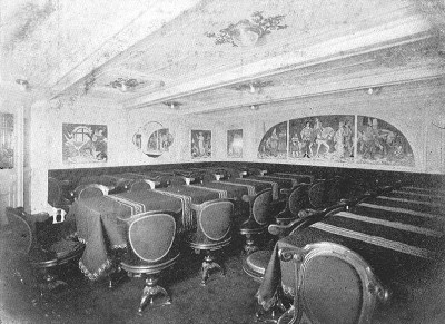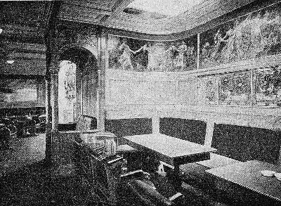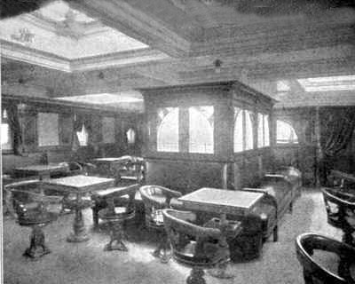 Широкие коридоры с обеих сторон корабля вели далее к курительной комнате и читальному залу. Курилка длиной 10,3 м, шириной 12,5 м и высотой 3,325 м по стилю относилась к раннему германскому ренессансу и была украшена своеобразной резьбой по дереву и соответствующими деревянными панелями. Белый потолок покрывали гербы немецких городов в богатых рамах. Так как через эту комнату можно было направить легкий свет с палубы внизу, появилась возможность сформировать ниши и углы, которые придавали комнате магию. Сиденья были обтянуты перфорированной кожей от знаменитой мастерской Г. Хюльбе. Воздух и свет проникал через два световых люка и два боковых окна достаточного размера.
