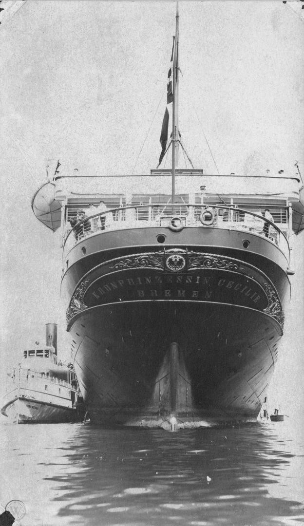 В июле 1907 года новая "Kronprinzessin Cecilie" должна была выйти из Бремерхафена в первый рейс, однако, прежде чем корабль был готов, он затонул у причала в гавани Бремерхафена. Лишь в следующем месяце, когда вода была откачана и судно отремонтировано, 6 августа оно смогло отправиться в путь.