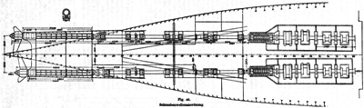 Двойное дно простиралось почти на всю длину корабля и поднималось сбоку до середины трюма, а не так, как это принято у торговых судов, до нижней кривой трюма. Глубина фальшпола под машинным отделением составляла 2300 мм, на остальной части корабля 1500 мм. Между центральной килевой пластиной и боковыми пластинами двойного дна по бокам были установлены пять непрерывных продольных ребер. Центральная продольная рама (средняя килевая пластина) была водонепроницаемой от 48 до 208 шпангоутов. Кроме того, через водонепроницаемые перегородки проходили 11 поперечных рам и разделяли двойное дно на 22 отдельных отсека. Само судно имело 17 поперечных переборок, 15 из которых доходили до верхней палубы и 2 - до промежуточной, а также продольную переборку по длине машинного отделения таким образом, что каждая из двух секций могла быть затоплена без потери плавучести корабля.