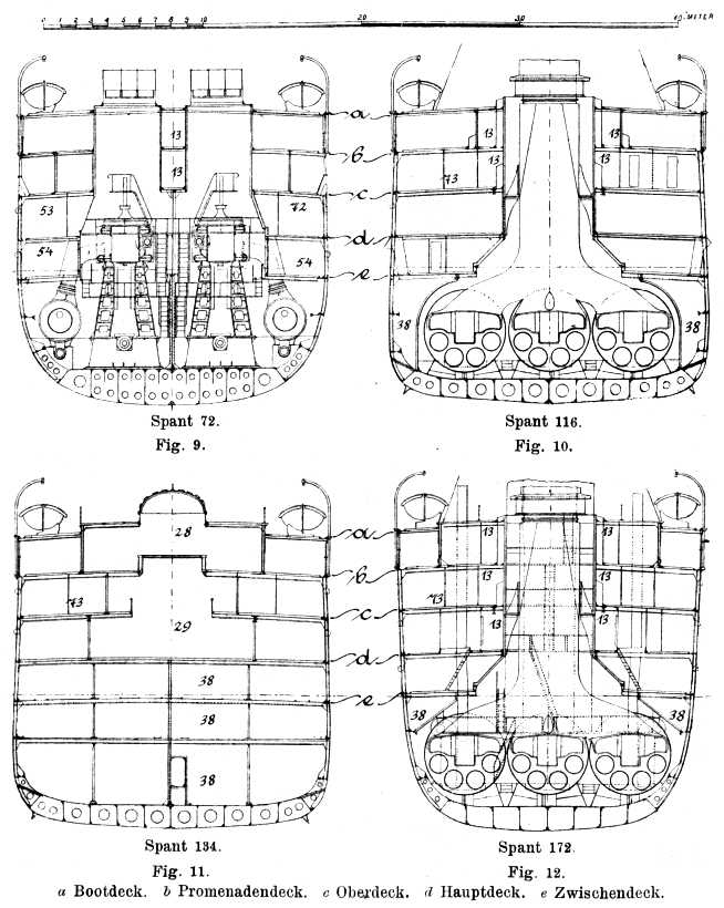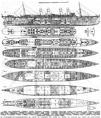 На корабле было шесть палуб: солнечная (Sonnenzeltdeck), прогулочная (Promenadendeck), верхняя (Oberdeck), главная (Hauptdeck), промежуточная (Zwischendeck) и жилая (Raumdeck).