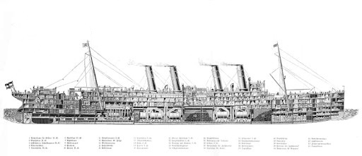 Средняя часть верхней палубы была полностью занята каютами для пассажиров 1-го класса. На главной палубе между двумя группами дымоходов от борта до борта простиралась столовая 1-го класса, а также большое количество кают класса люкс. Сзади к ней примыкала также столовая 2-го класса и смежные комнаты. Столовая 1-го класса находилась ближе всего к центру тяжести корпуса и поэтому была очень мало подвержена качке. Каюты пассажиров 1-го класса имелись на всех трех палубах, главной, верхней и прогулочной - также на миделе. Три лестницы были великолепно оформлены и имели многочисленные поручни, что-бы облегчить пассажирам передвижение при качке.