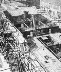 Помимо этого продольная прочность корабля обеспечивалась днищевыми и бортовыми стрингерами, а также карлингсами. Как следует из названия самой системы набора корпуса, самыми важными и мощными из них являлись днищевые стрингеры, которые проходили параллельно вертикальному килю. Между 30-м и 73-м шпангоутами их насчитывалось четыре штуки, причем I и 111 изготовлялись водонепроницаемыми, а II и IV - нефтенепроницаемыми. Ближе к оконечностям их количество сокращалась до двух. В корму продлевались только стрингеры 11 и IV. На 22-м шп. они поднимались вверх до настила платформы, образуя коридоры гребных валов. В нос же с 73-го до 90-го шпангоута шли стрингеры I и III.