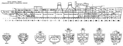 XVII-XV1II — погреба носовой группы орудий главного калибра, провизионные кладовые, холодильник провизии (в XVIII отсеке);