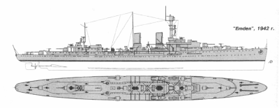 Первый послевоенный крейсер Германии. Спроектирован на основе последних крейсеров военного времени и являлся морально устаревшим уже к моменту ввода в строй. Большую часть своей карьеры интенсивно использовался в качестве учебного. До войны, с 1926 по 1938 гг., "Emden" совершил девять дальних походов, причем трижды обошел вокруг Земного Шара. Планировалось еше два кругосветных плавания, но приход к власти в Германии в 1933 г. нацистов вызвал сложности с организацией захода крейсера в порты США. Во время войны продолжал, в основном, использоваться, как учебный и дожил до конца войны, когда был выведен из строя во время крупного налета британской авиации на Киль.