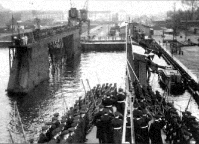 К 3 часам ночи 25 января ледокол и буксиры привели "Emden" в Пиллау, где его предполагалось за три дня подготовить к выходу в море. В этом порту гробы и большая часть пассажиров были выгружены. Останки Гинденбурга передали на плавбазу 1-й учебной дивизии подводных лодок "Pretoria", а вот дальнейший переход крейсера задержался. Только 30-го удалось собрать одну из турбин, и новый командир корабля капитан-цур-зее Вольфганг Келер довел его до Готенхафена, где на крейсер быстро вернули снятую артиллерию.