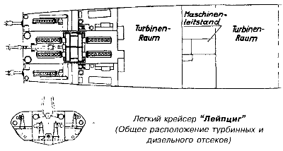 Для экономического хода, как и на "Leipzig", имелись 4 дизеля производства завода "MAN" (7 цилиндровые, 2 двухтактные) общей мощностью 12400 л.с., работавшие через зубчатый агрегат на центральный вал. Из-за сокращения объема топливных цистерн дальность плавания упала. Запас дизельного топлива равнялся 348 т. Дальность составляла: 3280 миль со скоростью 15 узлов, 2260 - 21 узел, 1700 - 27 узлов, 922 - 29,9 узла.