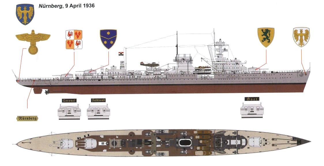 "Nürnberg", назначенный флагманом разведсил, носил полные регалии Кригсмарине, в том числе имена башен на лобовой плите, а также гербы по обоим сторонам. Имена и гербы были: Rear Admiral Ludwig von Reuter на башне "A", Captain Karl von Schönberg на башне "B" и Graf von Spee на башне "C". Герб корабля на обеих сторонах форштевня обозначал серебро и золото, представленные светло-серым и светлой охрой. Многие из гербов на кораблях Кригсмарине судов, как правило, имели очень много цветов и деталей, обозначающих металлы.