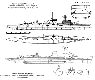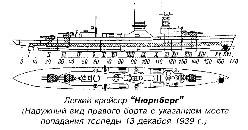 Повреждения германского легкого крейсера “Nürnberg” 13 декабря 1939 г.(Из книги И. М. Короткина Боевые повреждения надводных кораблей. Судпромгиз. 1960.)