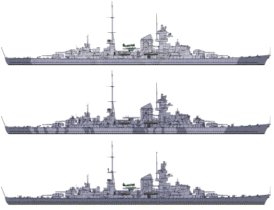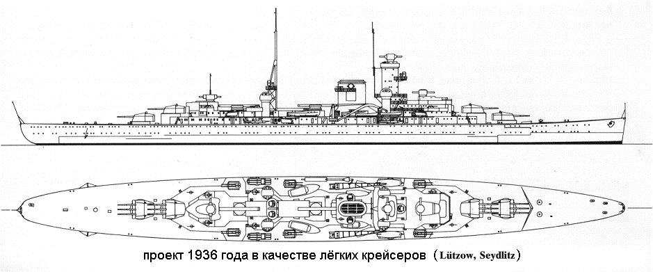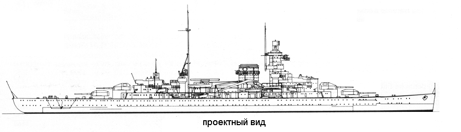 Летом того же 1934 года последовательно появились эскизные проекты крейсера в 10 160 т с умеренной скоростью 32 узла, быстро превратившийся в корабль водоизмещением 10 700 т. Хотя на бронирование выделялось свыше 20% веса (2140 т), удалось предусмотреть только 85-миллиметровые пояс, барбеты и траверзы, а также 30-мм палубу. На ПТЗ запаса уже не оставалось. В общем проект был воспринят благоприятно, хотя защиту его нельзя признать удовлетворительной: она не только значительно уступала бронированию французского "Algerie" и итальянских "Pola", но и являлась примерно эквивалентной защите большинства новых легких крейсеров. Адмирал Редер потребовал увеличения толщины лобовых плит башен до 120 мм, брони борта до 100 мм в районе погребов, а главное — преобразования новомодной плоской бронепалубы, идущей по верхней кромке пояса (так защищались все зарубежные крейсера 30-х годов), в традиционную конструкцию со скосами, заметно усиливавшими эффективную защиту жизненно важных частей при попаданиях в нижнюю часть борта. Предполагалось также усилить горизонтальную броню в зоне погребов до 50 мм. Забегая вперед отметим, что даже эти весьма умеренные требования полностью выполнить не удалось.