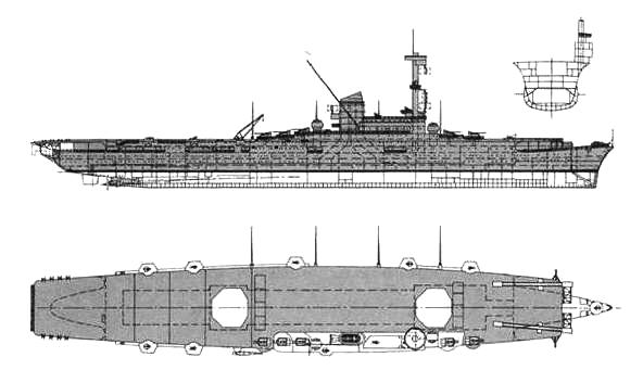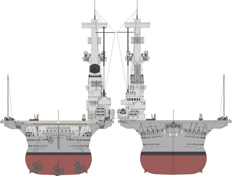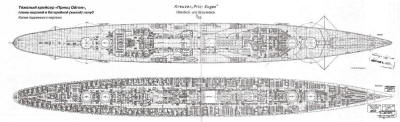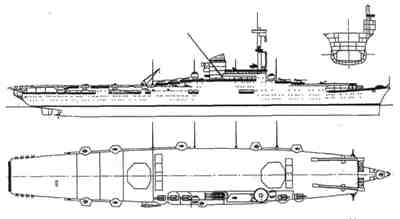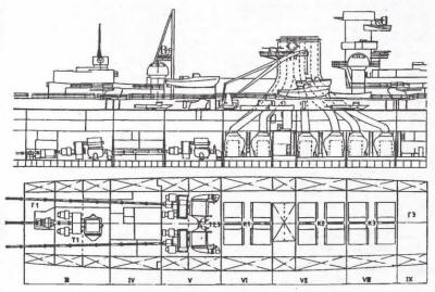 В нижней надстройке, простиравшейся от 1-го до 4-го барбета, львиная доля пространства приходилась на все те же дымоходы, а также ангары и вспомогательные помещения для авиаоборудования. Оставались две зоны: спереди, где находился медицинский блок, и сзади, где шли каюты командного состава. Еше далее в корму, сразу за барбетом кормовой возвышенной башни, помешалась обширная кают-компания, где одновременно могли обедать до 60 офицеров. Мед-часть крейсера имела хорошее оборудование и включала специальные помещения для операционной и рентгеновского кабинета.