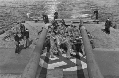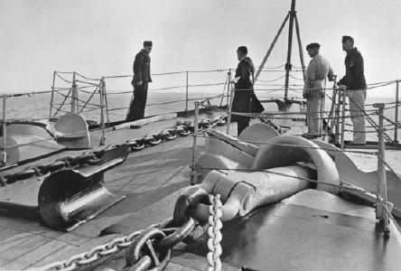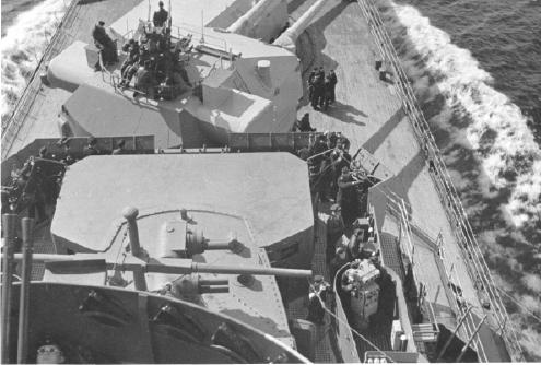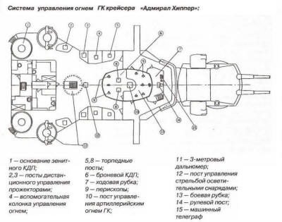 Второй уровень надстройки в корме целиком выделялся "святая святых" — блоку помещений командира корабля. Там имелись кабинет, спальня и ванная, практически идентичные адмиральским помещениям, расположенным в той же надстройке по правому борту. В блок адмиральских помещений кроме того входила еще и большая приемная, использовавшаяся в качестве зала для важных совещаний. Аналогичный уровень носовой надстройки использовался для кают командного состава корабля. В этом отношении немцы отступили от многовековой морской традиции, в соответствии с которой весь командный состав сосредотачивался в корме. (Для этого на "хипперах" просто не было места.)