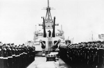 15 августа на "Петропавловске" был поднят военно-морской флаг и он вступил в состав советского флота. В соответствии со своим состоянием крейсер включили в отряд вновь строящихся военных кораблей КБФ. К этому времени над корпусом возвышался первый уровень надстройки, основание носового и кормового мостиков, труба и временная нижняя часть грот-мачты.