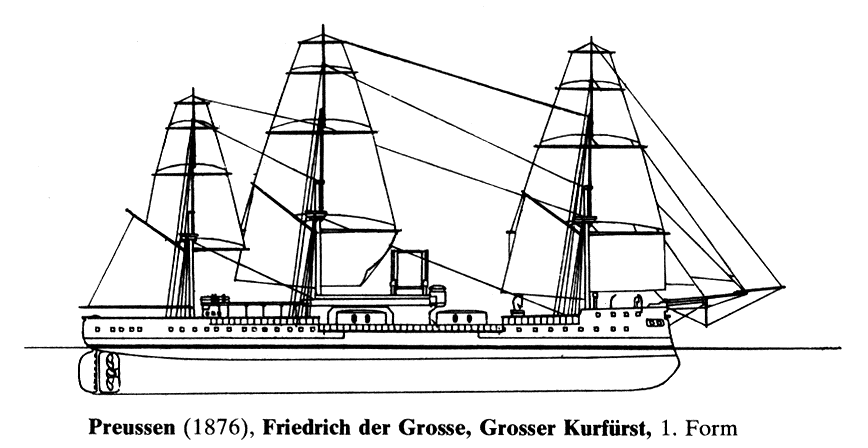В серию из трёх кораблей входили "Preußen" (Пруссия), "Friedrich der Große" (Фридрих II Великий, король Пруссии в 1712-1786 гг., завоевал выход Германии к морю) и "Großer Kurfürst" (Курфюрст Бранденбургский Фридрих Вильгельм, 1620-1688 гг., первым пытавшийся создать для Германии военно-морской флот). Первоначально первые два корабли предполагалось назвать "Borussia", "König Friedrich der Große" и "Der große Kurfürst". Großer Kurfürst был заложен первым на "Kaiserliche Werft" в Вильгельмсхафене в 1869 г., но спущен на воду последним, 17 сентября 1875 г., вступил в строй 6 мая 1878 г. Стоимость корабля составила 7 303 000 марок. Friedrich der Große заложен вторым в Киле на верфи "Kaiserliche Werft" в 1871 г., спущен на воду также вторым, 20 сентября 1874 г., вторым-же и вступил в строй 22 ноября 1877 г. Стоимость корабля составила составила 7 303 417 марок. Preußen строился в Штеттине на частной верфи "A.G. Vulkan". В то время ещё ни одна из немецких частных верфей не имела достаточного опыта в постройке броненосных кораблей и из последних заявку подала только она. В военно-морском министерстве возникли сомнения относительно передачи заказа одного из броненосных фрегатов частной компании, в связи с чем ей даже рекомендовалось отозвать свою заявку, «поскольку вряд ли она может рассчитывать на дальнейшие заказы в будущем». Наконец, 6 ноября 1870 года ведомство всё-же решило поручить Вулкану строительство одного из броненосных фрегатов, для которого планировалось название «Боруссия». Он был заложен третьим в 1871 г., но спущен на воду первым 22 ноября 1873 г. и первым вступил в строй 4 июля 1876 г. Он обошёлся казне несколько дешевле собратьев - его стоимость составила 7 038 097 марок.
