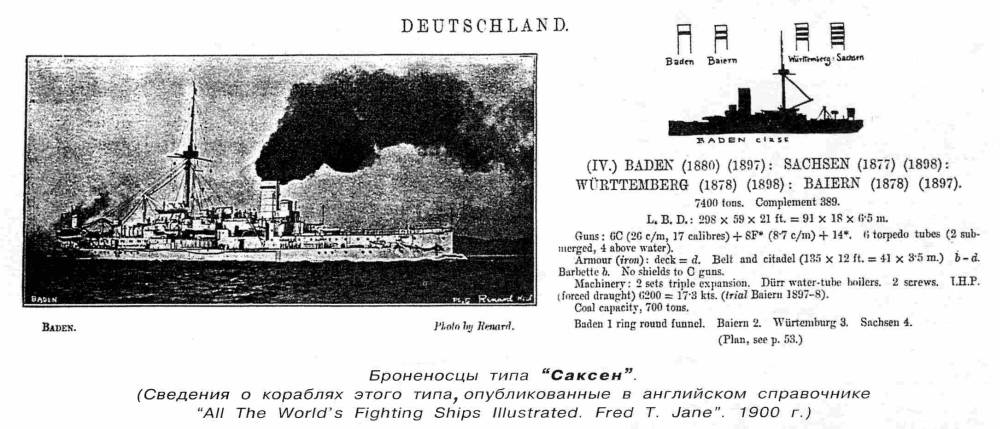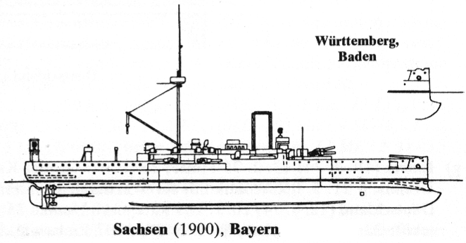 Четыре корабля вошли в строй с 1878 по 1883 г, последний из пяти запланированных, Oldenburg, построили по другому проекту. Их названия, Sachsen (Саксония), Bayern (Бавария), Württemberg (Вюртемберг) и Baden (Баден) соответствовали названиям "новых территорий" - немецких земель, вошедших в состав империи под властью Пруссии в 1871 году. Впоследствии эти имена присвоили последним, самым мощным дредноутам. Хотя первым на верфи "Kaiserliche Werft" в Киле был заложен в 1874 году будущий Bayern, серия получила название по первому спущенному и, соответственно, первому, получившему имя - Sachsen. Броненосцы оказались не очень удачными - скорость и мореходность были весьма посредственными, на волнении ход ощутимо падал, а в шторм они вообще не могли идти против волны, кроме того они плохо держались на курсе. Первые годы машины постоянно выходили из строя и корабли проводили много времени в ремонтах. Во второй половине 90-х годов броненосцы капитально перестроили. Они стали однотрубными, старая броня была заменена на современную крупповскую, скорость увеличивалась на один узел. С кораблей также убрали всё дерево. Но дорогостоящая модернизация ненамного улучшила боевые качества стариков. В 1906 году Württemberg превратили в опытовое судно с вооружением из 7 торпедных аппаратов и четырех 88-мм пушек. Он оставался в строю до конца первой мировой войны. Его систершипы исключили из состава флота в 1910 году, но они продолжали служить вспомогательными судами. Самый долговечный из них, Baden, сдали на слом в 1939 году.