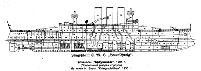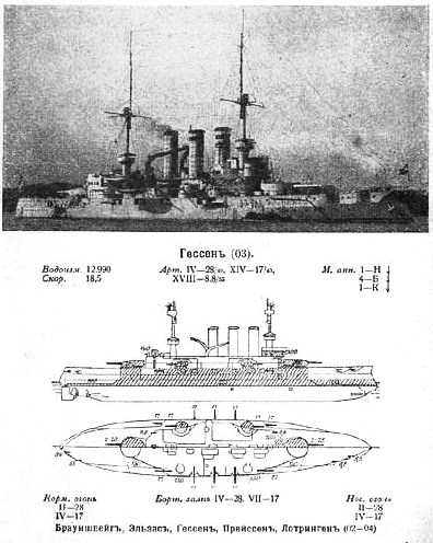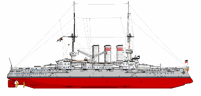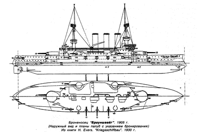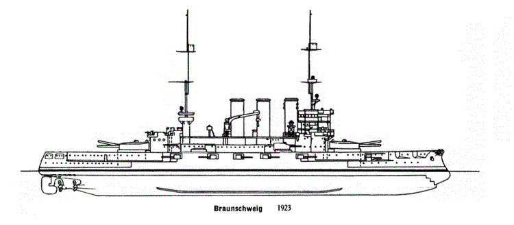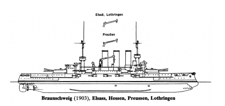 1-я серия броненосцев, построенных по программе 1898 г. Схема бронирования практически в точности повторяла вариант Wittelsbach, но вооружение значительно усилилось. Фирма Круппа - монопольный поставщик морских орудий - успела разработать более мощные 280-мм орудия (хотя все еще уступавшие двенадцатидюймовкам других стран). Изменилась и средняя артиллерия. Её попытались еще более усилить за счет замены в общем-то обычного 150-мм калибра на 170-мм. При этом количество пушек уменьшилось с 18 до 14, но за счет устранения смещенных к оконечностям установок, которые на предыдущих кораблях все равно было трудно использовать из-за сильного заливания на большой скорости. 170-мм калибр, по мнению специалистов, соответствовал максимальному весу снаряда (около 70 кг), с которым еще можно было иметь дело в отсутствии механической системы заряжания; потенциальные же противники Германии считали, и этот вес слишком большим для казематной установки и подвергли "Braunschweig" такой же критике, как и их предшественников.