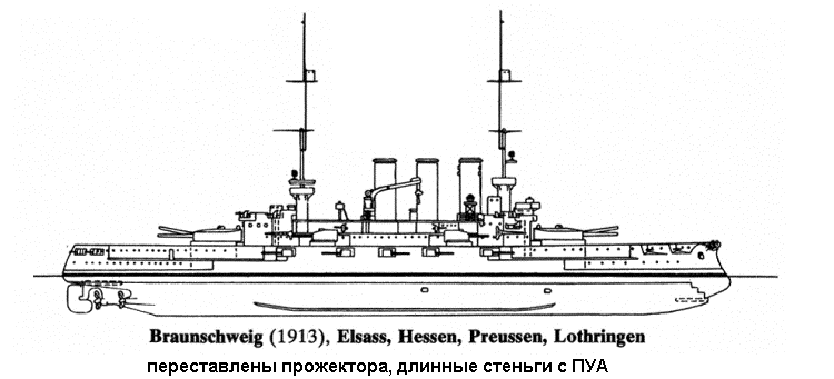 С 1914 г. на Braunschweig и Elsass расположение прожекторов: по одному на топах мачт и 2 на площадках у носовой трубы.