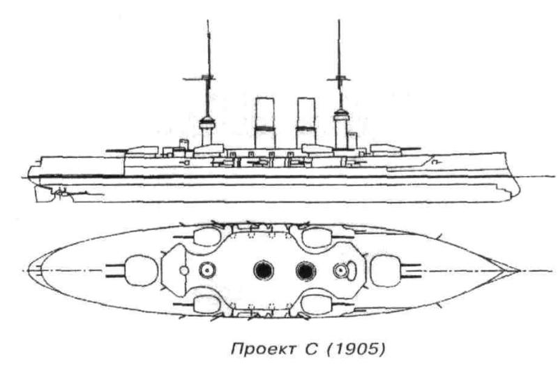 После ряда доработок в октябре 1905 года на рассмотрение предложили новый проект "С". Его основным отличием явилось полное изменение состава вооружения на единый главный калибр. В шести башнях установили восемь 280-мм/40-калиберных орудий - в двух двухорудийных в оконечностях и четырех одноорудийных по бортам, причем в бортовом залпе могли участвовать шесть из восьми пушек. Восемь 170-мм/40-калиберных орудия разместили в казематах центральной батареи. Их дополняли двадцать 88-мм пушек, предназначенных в основном для противоминной обороны, большую часть которых также сосредоточили в средней части корабля. Имелись несколько подводных ТА.
