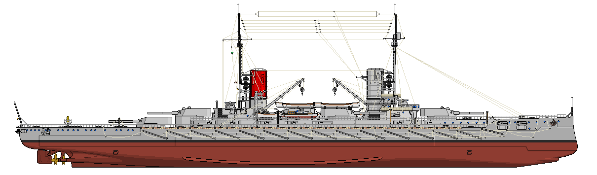Торпедное вооружение По сравнению с дредноутами первых двух серий, торпедное вооружение ослабили за счёт сокращения количества ТА до пяти подводных 500-мм (один носовой и четыре бортовых, с боекомплектом 16, по другим данным - 19-20 торпед). Торпеды G/6c несли заряд в 160 кг ВВ и могли пройти 5000 м на 27 узлах или 2200 м на 35 узлах. Аппараты расположили как обычно, за исключением кормового. Здесь уже наметилась переоценка подхода к торпедному вооружению линкоров, которому по-прежнему придавали большое значение, но уже начали возникать сомнения в эффективности его применения в линейном бою. В период первой мировой войны эти сомнения подтвердились. Крупные корабли воюющих держав за всю войну не добились ни одного попадания торпедой. Большие затраты оказались бесполезными. Это выразилось как излишней весовой нагрузкой, так и занимаемым объёмом помещений корпуса. Торпедные отсеки, главным образом бортовых ТА, занимали от борта до борта очень большой объём помещений, и их трудно было разместить. Поскольку большей частью они располагались по концам цитадели, а также в сужающихся частях корпуса, их защита от подводного попадания была довольно слабой. Затопление этих отсеков могло вызвать серьезное нарушение плавучести. 8 110-см прожекторов были сгруппированы в двух позициях, на двухъярусных платформах у мачт.