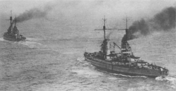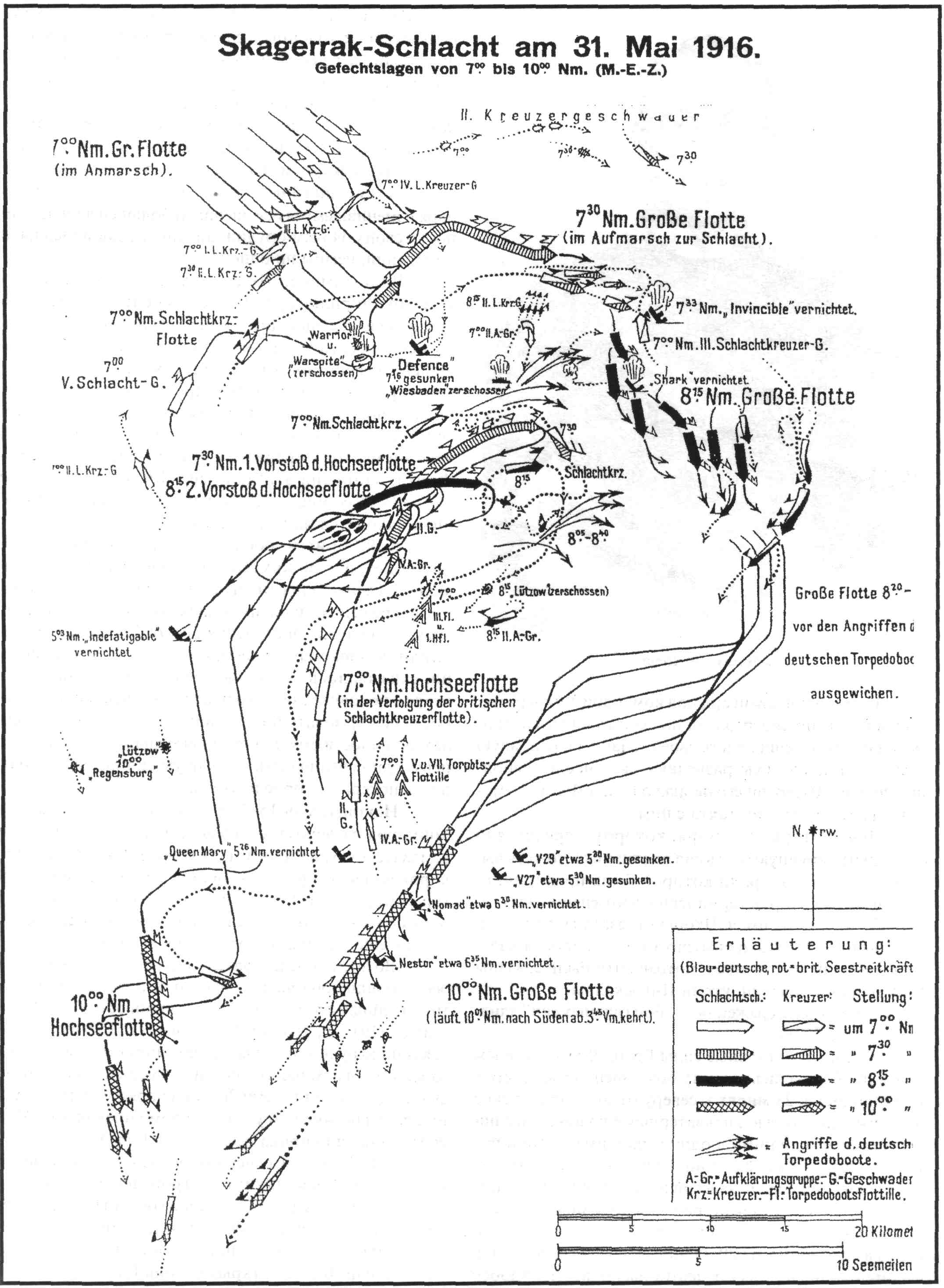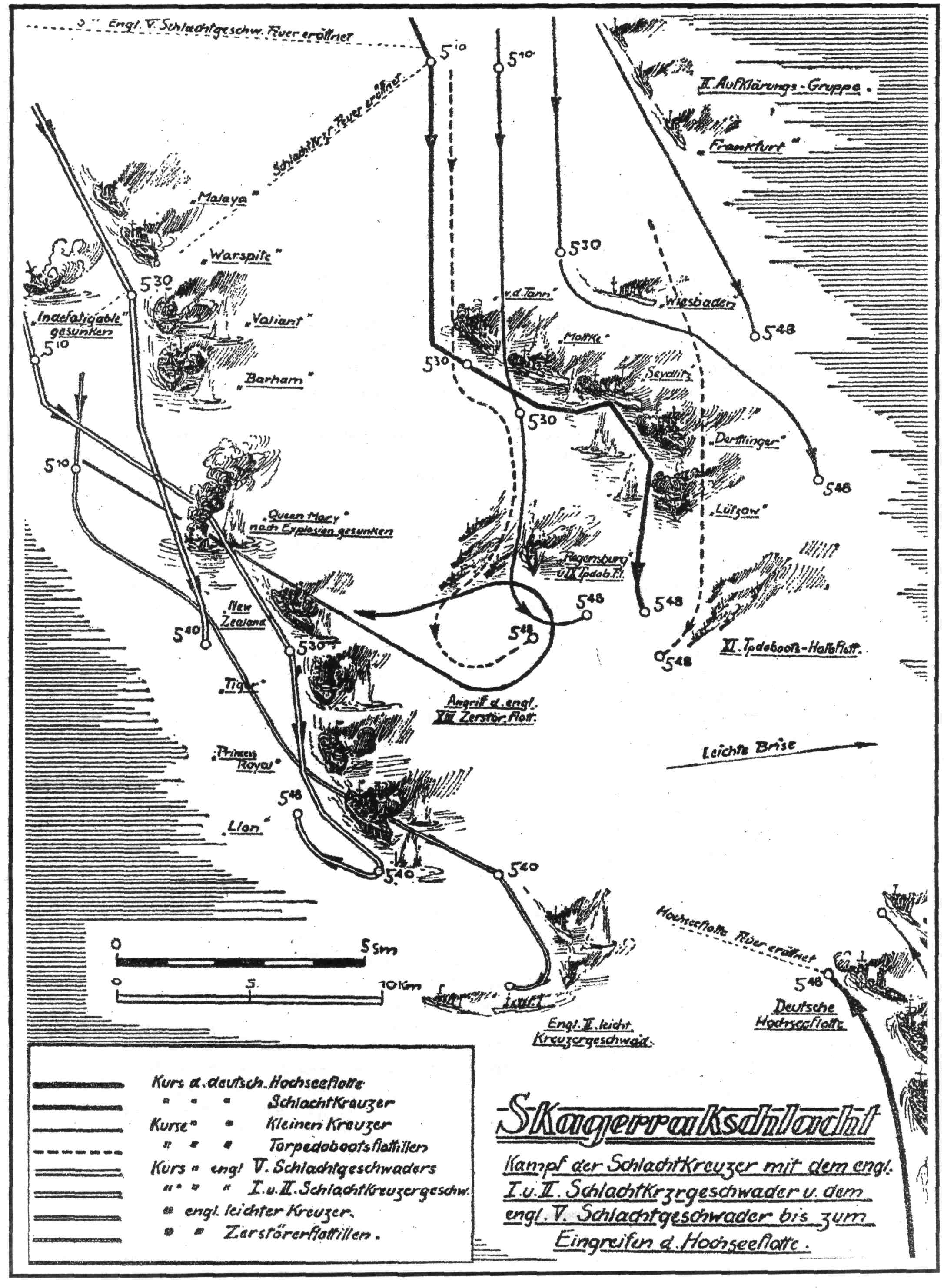Friedrich der GroßeВ канун генерального сражения младший флагман III-й эскадры контр-адмирал Нордман перешёл на Kaiser. Из дредноутов к этому сроку не боеготовыми оказались Bayern, ещё не прошедший курс боевой подготовки, и König Albert. Friedrich der GroßeО готовности Seydlitz командованию флота Открытого моря доложили ещё 22 мая, но проведённые 23 мая испытания на водонепроницаемость показали, что продольные переборки одного из помещений бортовых ТА пропускают воду и необходимо ещё пять рабочих дней для окончательного исправления повреждений, полученных при подрыве на мине 25 апреля. 29 мая Seydlitz снова был в полной боевой готовности. Поскольку командующий флотом очень рассчитывал на этот корабль, уже запланированная на несколько дней раньше боевая операция флота могла состояться не ранее этого дня. Friedrich der GroßeИз-за плохой погоды Шеер не смог использовать для разведки дирижабли, и опасаясь, что без воздушной разведки набег на Сандерленд может привести к неожиданной встрече с превосходящими силами англичан, Шеер изменил план. Он решил произвести демонстрацию, послав к Скагерраку и берегам Норвегии линейные крейсера, в расчете отвлечь на них английские линейные крейсера, которые и уничтожить подошедшими основными силами флота. KaiserК 30 мая корабли флота Открытого моря собрались на рейдах Вильгельмсхафена и Яде. К участию в операции привлекались: Friedrich der Große (флагманский корабль командующего флотом Открытого моря), 1-я (восемь дредноутов типа Nassau и Helgoland), III-я (семь дредноутов типа König и Kaiser, без König Albert), II-я линейные эскадры (шесть додредноутов), 1-я группа разведывательных кораблей (пять линейных крейсеров), 2-я и 3-я группы разведывательных кораблей (девять лёгких крейсеров), торпедные силы (два лёгких крейсера и 62 эсминца). KaiserАвангард с линейными крейсерами вице-адмирала Хиппера вышел с рейда Яде 31 мая в 02.00. В 03.30 в Вильгемсхафене вице-адмирал Шеер приказал основным силам флота Открытого моря поднять якоря и следовать в 50 милях за авангардом. Поход проходил вдоль побережья Ютландского полуострова на север в направлении м. Скаген. Первый выстрел в Ютландском сражении раздался в 15.28 (по берлинскому времени) с британского лёгкого крейсера "Galatea" по немецкому эсминцу. Около 16.30 линейные крейсера противников обнаружили друг друга и в первой фазе Ютландского сражения (16.30 - 17.40), известной как "бой авангардов" или "бег на юг", Хиппер при появлении шести английских линейных крейсеров Битти повернул пять своих крейсеров последовательно на обратный курс с целью навести англичан на свои главные силы. В 16.48 линейные крейсера обеих сторон открыли огонь с дистанции 15400м (83 кбт.). В период с 17.02-17.05 от снарядов Von Der Tann взорвался и погиб британский "Indefatigable" (1909 г., 19100 т, 8 305-мм, 26,7 уз.). В период с 17.24-17.26 Derfflinger и Seydlitz потопили "Queen Mary" (1913 г., 26770 т, 8 343-мм, 28 уз.). KaiserНачалась вторая фаза Ютландского сражения (17.40 - 18.50) — "бег на север". С обнаружением в 11-12 милях впереди себя германских главных сил и чтобы избежать новых потерь, в 17.40 вице-адмирал Битти повернул свои крейсера последовательно на 16 румбов (180°) и лёг курсом на север на соединение с Гранд-Флитом. В 17.45 Битти донес адмиралу Джеллико об обнаружении в юго-восточном направлении неприятельского линейного флота и показал своё место. Когда Битти пошёл на сближение со своими главными силами, Хиппер, повернув "все вдруг" на 16 румбов, последовал за н