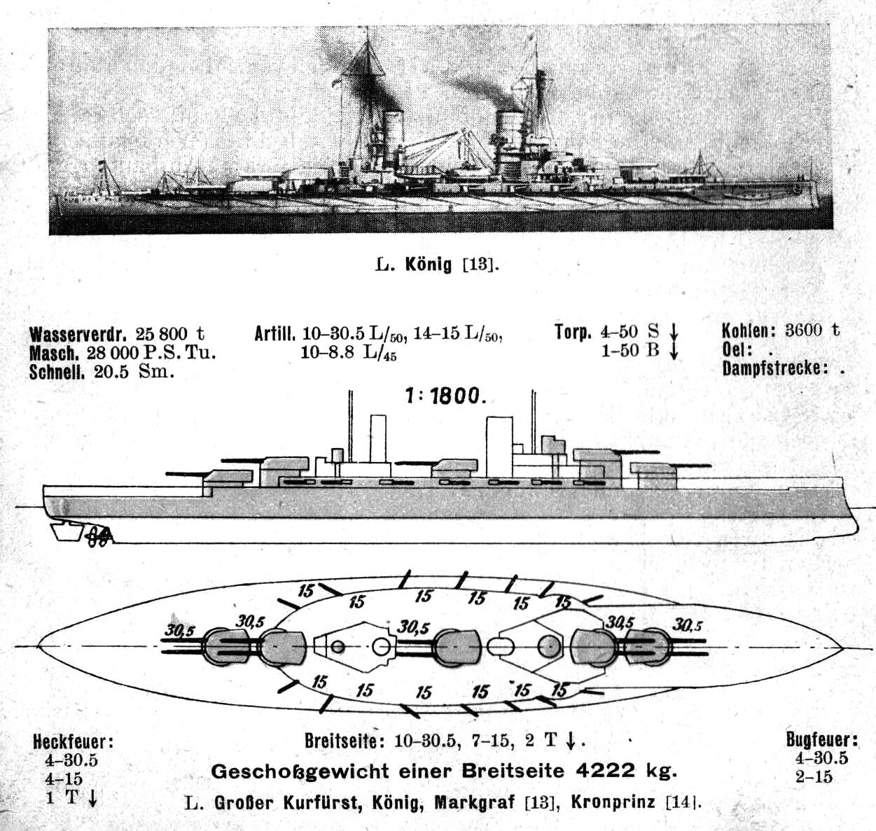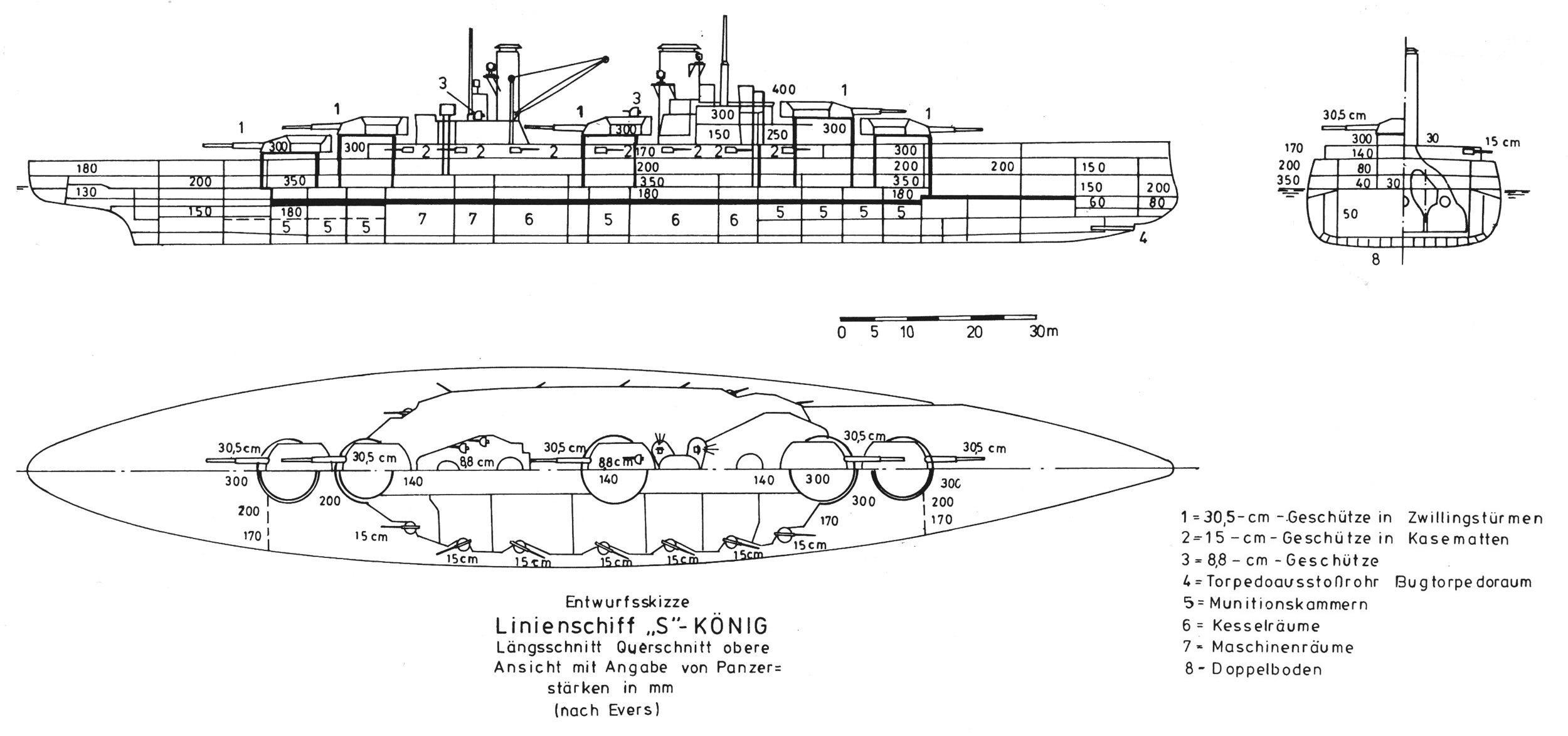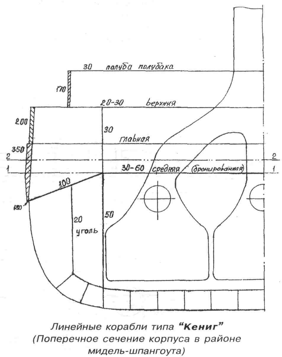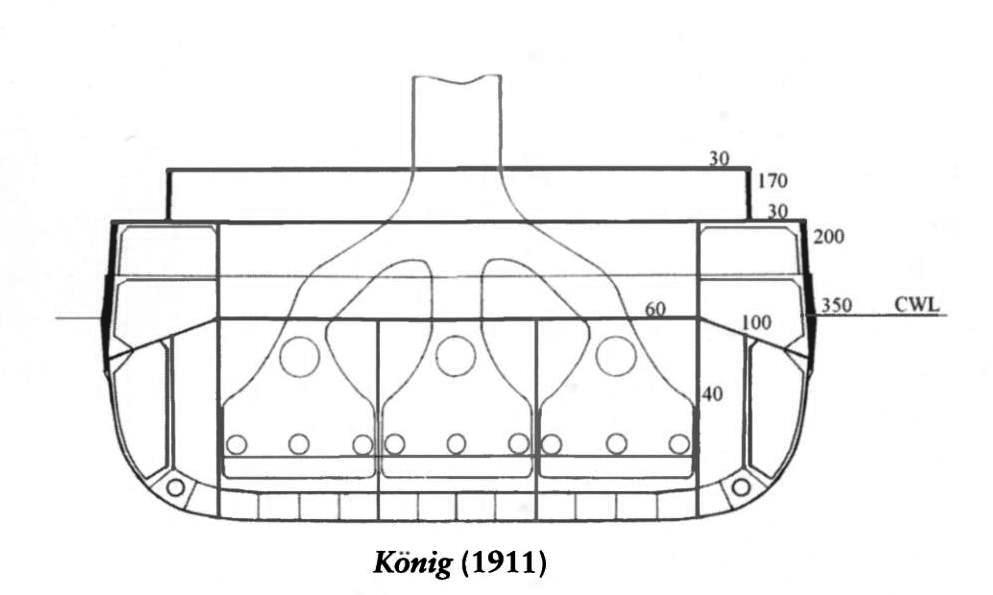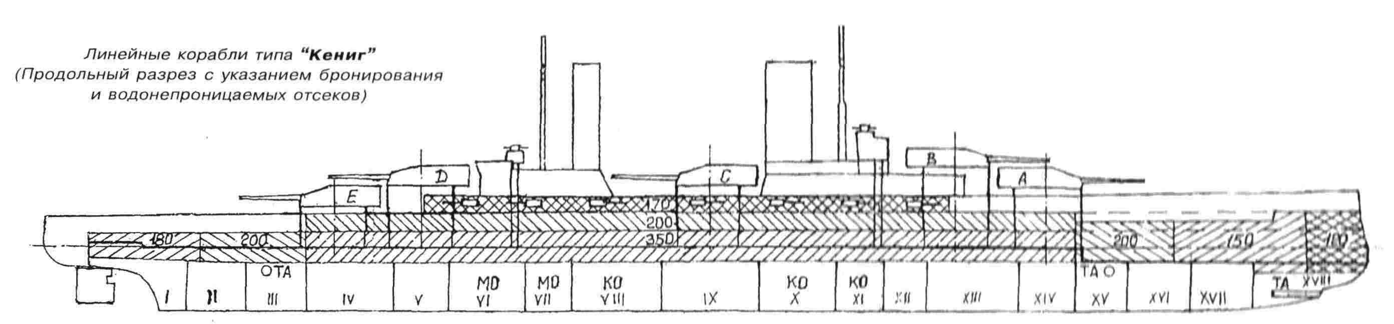 Палубу полубака забронировали частично, она имела 30-мм толщину над казематом 150-мм орудий. Верхнюю палубу забронировали на всей площади. У типа "König" верхняя палуба имела 30-мм толщину в средней части корабля вне каземата и 20-мм, как настил его пола. В корме и средней части бронированную палубу установили на уровне средней, в носовой оконечности на уровне нижней, соединив поперечной броневой переборкой. Защита артиллерии Согласно Брайеру и Грёнеру, 305-мм башенные установки имели 300-мм толщину лицевых плит. 250-мм боковые стенки, 290-мм заднюю стенку, 110-мм наклонную часть крыши и 80-мм плоскую её часть: Конвэю. толщина стенок/крыши башен 300, 250, 170-100 мм. Барбеты с внутренним диаметром 8,5 м имели сплошное круговое бронирование переменной толщины, величина которого изменялась в пределах 300-80 мм. уменьшаясь с 300 мм до 220 мм там, где они перекрывали один другого. Не защищённые ничем наружные части концевых барбетов имели 300-мм толщину до бронированной палубы, но позади верхнего броневого пояса её уменьшили до 140 мм, а главного 80 мм. С учётом 300-мм толщины стенки максимальный наружный диаметр барбета составлял 9,1 м. Рубки Стенки передней боевой рубки имели 350-мм толщину с обычным увеличением до 400-мм в районе смотровых щелей, 180-мм крышей, в то время как задние боевые рубки имели 200-мм толщину стенок и 50-мм крышу (у типа "Helgoland": толщина стенок/крыши передней боевой рубки 400/100 мм, задней 200/50 мм). Противоторпедные переборки Согласно Брайеру, Конвэю и Грёнеру, толщина листов противоторпедных переборок у дредноутов типа "König", согласно Брайеру и Грёнеру, составляла 40 мм; по Конвэю - 50 мм. На всех линкорах противоторпедные переборки продолжались 30-мм противоосколочной переборкой до верхней палубы. Противоторпедная переборка имела такую же длину, что и 350-мм главный броневой пояс, и в районе миделя проходила на расстоянии около 4 м от бортовой обшивки. Ещё одну (более тонкую) 20-мм переборку установили на половине расстояния от наружной обшивки корпуса. Эта переборка с обшивкой борта образовывала коффердам. Коффердам оставался пустым, как камера расширения при взрыве, а расположенные между двумя продольными переборками помещения заполняли углём и использовали как угольные ямы. В противоторпедной переборке двери типа гильотин обеспечивали доступ из них в кочегарки. Остальные угольные ямы расположили на бронированной палубе по обе стороны от противоосколочной переборки. На крупных германских кораблях доставка угля из кочегарок была неизмеримо трудна. Зато эта система обеспечивала хорошую противоторпедную защиту, но вызывала дополнительные трудности для работы систем осушения и кренования в средней части корабля. В носовой оконечности системы осушения и кренования работали также не в самых лучших условиях, особенно выше бронированной палубы, и большие помещения бортовых 600-мм ТА не улучшали положения установленных в них систем. Главная поперечная броневая переборка имела толщину 300 мм от бронированной палубы до главной между противоторпедными и противоосколочными переборками, 200 мм вне их и 170 мм между главной и верхней. У типа "König", согласно Брайеру, толщина плит поперечных броневых переборок в кормовой и носовой оконечностях составляла 170-200 мм; по Конвэю - 300-130 мм. Германские дредноуты и современные им линейные крейсера всегда имели репутацию хорошо защи