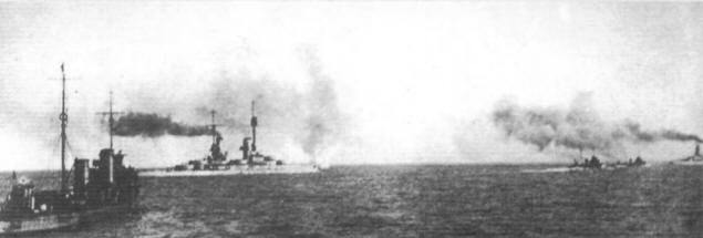 KönigКроме "Moltke" в операции в составе "специального соединения" с 11 по 19 октября задействовали 10 дредноутов III-й ("Bayern", "König", "Kronprinz", "Großer Kurfürst" и "Markgraf") и IV-й ("Kaiser", "Friedrich der Große", "Kaiserin", "Prinzregent Luitpold", "König Albert") линейных эскадр. 23 сентября III-я (типа "König") и IV-я (типа "Kaiser") эскадры линкоров вышли из Киля на рандеву на подходах к Путцигер-Вик (Данцигская бухта), где 24 сентября стали на якорь, а с 25 сентября по 9 октября находились в полной боевой готовности и откуда 10 октября направились к Либаве. 10 октября на Либавском рейде началась погрузка на транспорты войск десанта. На рассвете 11 октября из района Путцигер-Вик к Либаве подошли линейный крейсер "Moltke" и линкоры III-й и IV-й эскадр. Утром 11 октября из Либавы вышел авангард десанта. За ним следовали III-я эскадра линкоров, флагманский "Moltke", лёгкий крейсер "Emden" и IV-я эскадра линкоров в охранении 17 эсминцев. Затем на значительном удалении следовали транспорты с главными силами десанта. Вечером 11 октября "König", "Kronprinz", "Großer Kurfürst" и "Markgraf" стали на якорь на северных подходах к бухте Тагалахт. Ранним утром 12 октября линкоры вошли в бухту Тагалахт, в 05.50 открыли огонь по стрелявшей по ним береговой батарее на м. Пинает и также быстро её подавили. После обстрела в 17.30 "König" ушёл в Нойфарвассер, но 16 октября вернулся в Рижский залив и стал на якорь в Аренсбурге. Markgraf13 октября "Großer Kurfürst" со скоростью хода 8-12 уз. направился в Данциг, 14 октября прибыл в Нойфарвассер, 16 октября в Киль и 18 октября, пройдя Кайзер-Вильгельм каналом в Вильгельмсхафен, где на имперской верфи его повреждения отремонтировали к 1 декабря. KönigОдновременно с попыткой прорваться в Моонзунд через Кассарский плёс 14 октября германский флот предпринял усилия для прорыва в Рижский залив через Ирбенский проход, где за тральщиками и прикрывающими их крейсерами с целью уничтожения устаревших линкоров "Слава" (1905 г., 13516/14826 т, 4 305-мм, 12 152-мм, 17,7 уз.) и "Гражданин" (б. "Цесаревич", 1903 г., 13200 т, 4 305-мм, 12 152-мм, 16,8 уз.) следовали "König", "Kronprinz" и "Markgraf". Здесь основную опасность представляли минные заграждения. Markgraf17 октября около 08.00 миноносцы "Дельный" и "Деятельный", высланные в дозор в Рижский залив, обнаружили на юго-востоке германскую эскадру в количестве 28 вымпелов и донесли о приближении её к Моонзунду, указав наличие двух дредноутов. Германская эскадра подходила в следующем составе: два линкора типа "König", пять лёгких крейсеров, два больших транспорта, большое количество эсминцев и тральщиков. "König" и "Kronprinz" под охраной восьми эсминцев, имея в голове тральщики, шли курсом норд к западному проходу в Моонзунд. Großer KurfürstГерманские тральщики, дойдя до линии мин, развернулись и приступили к тралению. С началом траления оба дредноута отделились от эскадры и, пройдя протраленное пространство, легли на ост, открыв в 09.40 стрельбу всем бортом. В 10.05 "Слава" открыл огонь по головным тральщикам с дистанции 20800 м (112 кбт.). Третьим залпом "Славы" тральщики были накрыты, и они после нескольких следующих залпов, поставив дымовую завесу, отошли. Kronprinz